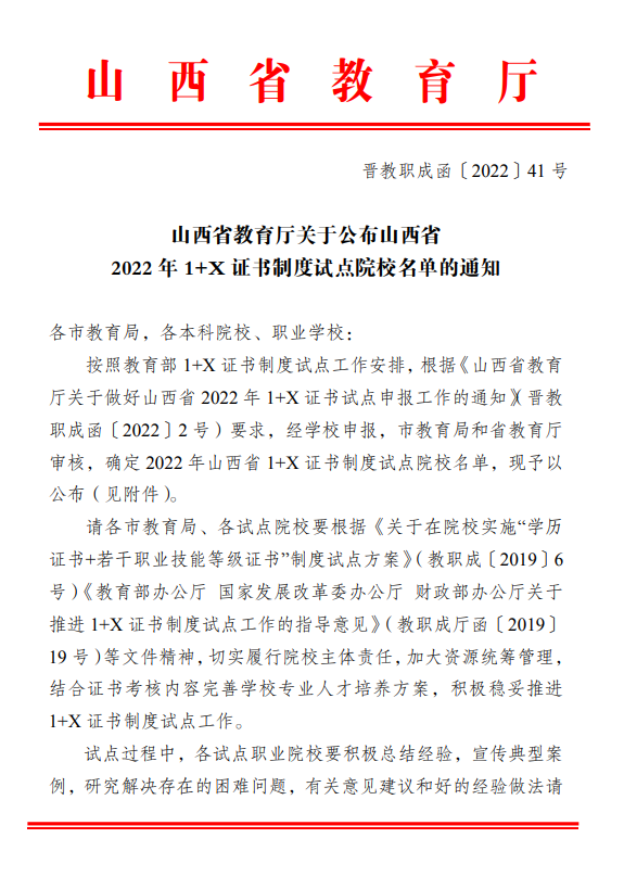 为贯彻落实《关于在院校实施“学历证书+若干职业技能等级证书”制度试点方案》(教职成[2019]6号)和《关于推进1+X证书制度试点工作的指导意见》(教职成厅函[2019]19号)文件精神,根据《山西省教育厅关于做好山西省2022年1+X证书试点申报工作的通知》要求,瓜子tv